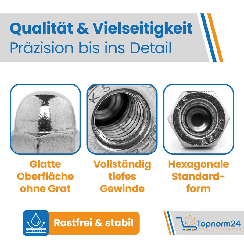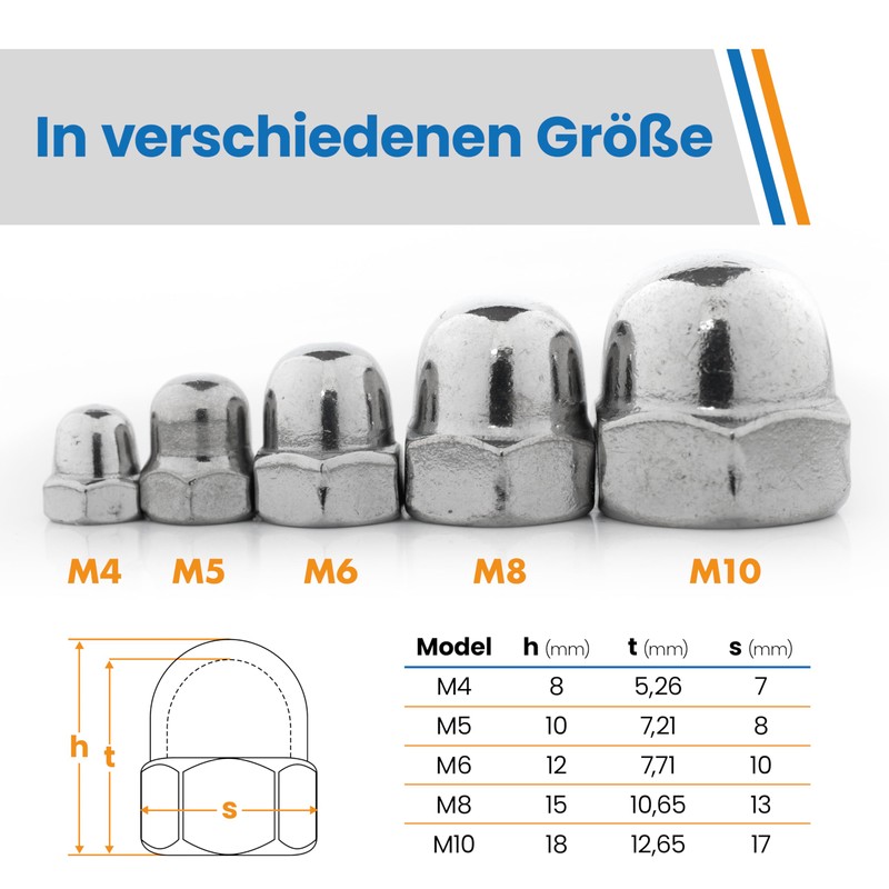 - Required quantities – whether 10 cap nuts in stainless steel for a small repair or 100 cap nuts for the construction of your garden shed, with us you have the free choice.