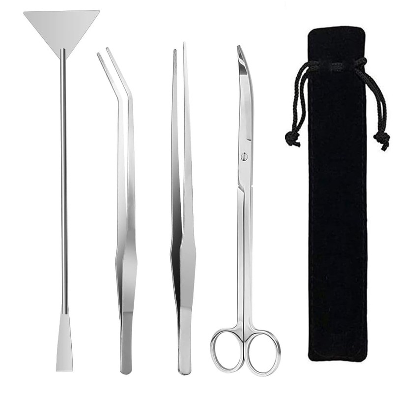 - 【4 in 1 Aquascape Tools Kits】: Aquarium tank aquascape tools kits including 1*10.5" curved scissors, 1*10" straight tweezers, 1*10" curved tweezers, 1*12.5" sand spatula, one kit, multi-function.