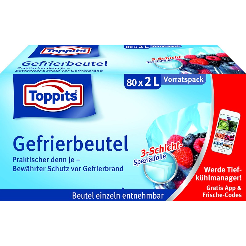 - Lieferumfang: 1 Vorratspackung Toppits Gefrierbeutel, Volumen: 2 Liter, Inhalt: 80 Stück, Transparent