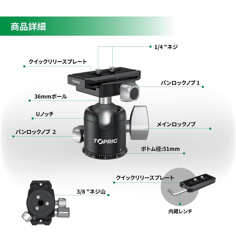 - 【Strong Load Capacity】The Toprig ball head is a large 36mm sphere that provides strong support up to 20kg/44lbs The Toprig tripod mount also adopts high quality, high density aluminum alloy and all CNC anodized technology