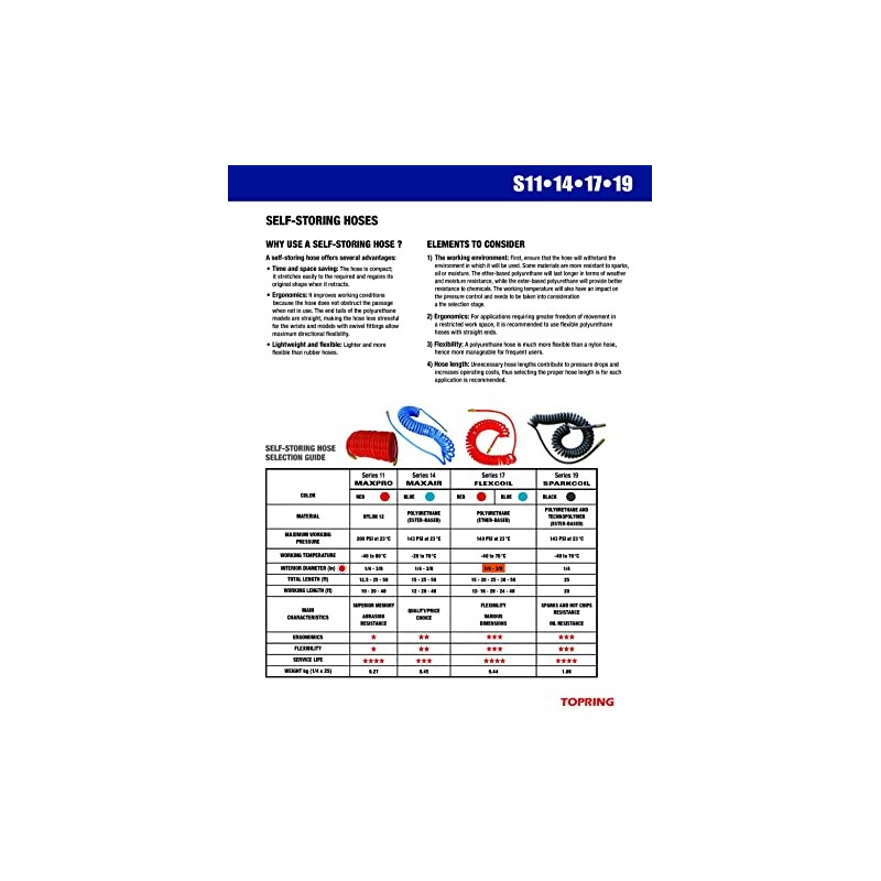 TOPRING 11.421 MAXPRO Nylon Self-Storing Spiral Recoil Air Compressor Hose with Brass Fittings, 200 PSI, 1/4 I.D. X 12.5 FT. X 1/4(M) NPT, Series 11