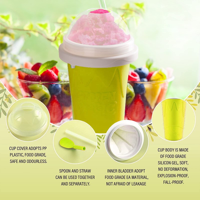 - đ§Quick Freeze Technology: Built-in freezing liquid,transform your favorite drinks (such as cola or juice) into refreshing slush in a few seconds using this magic cup. Just put the Frozen Magic Cup in the freezer for 5-6 hours and pour-in any drink the way you like it and squeeze it... your drink is done! You can also experiment with different flavors like juices, soda, or even add milk to make a thick shake or ice-cream.