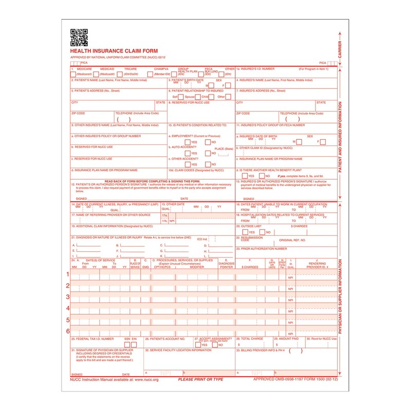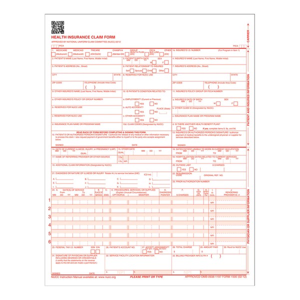 Health insurance claim forms are printed front and back in red OCR ink on white, letter-size, 20 lb. bond for convenient scanning. Forms are compatible with laser printers.