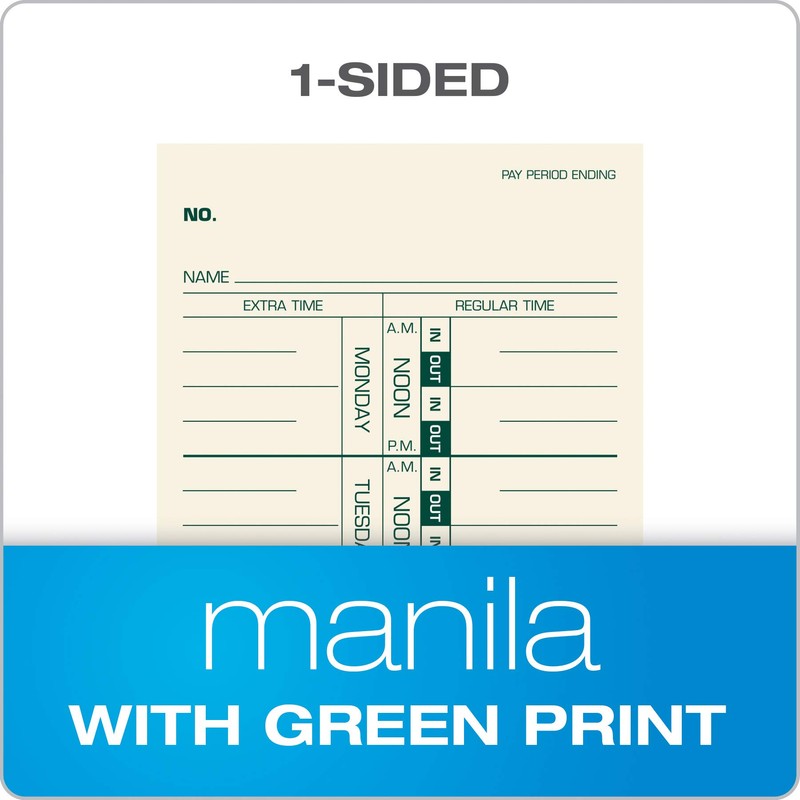 TOPS 1-Sided Weekly Time Cards work the same as equivalent cards from your time clock manufacturer. These manila cards with green ink show named days for a seven-day week. Use the right side to track regular time and the left to track extra time. Easy, economical and efficient.Weekly 1-Sided Time Cards. Regular/Extra Time. 3-1/2" x 9". 500 Cards Per Box.Save over manufacturer's brands: The old adage "time is money" was never more true. These sturdy time cards are a bargain and work the same as cards from big time-machine brands.7 Days A Week: Manila cards with easy-to-read green type spell out the days of the week, Monday through Sunday.Extra/Regular Time: Track regular time on the left, extra time on the right. Compatible with edge printing/side feeding time clocks. (For top-feeding cards, see TOPS 1261, 12613 or 1262.)Value Packs: Stock up on this essential. Get 500 time cards per box.