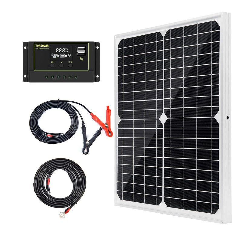 Topsolar Solar Panel Kit 20W 12V Monocrystalline with 10A Solar Charge Controller + Extension Cable with Battery Clips O-Ring Terminal for RV Marine Boat Off Grid System