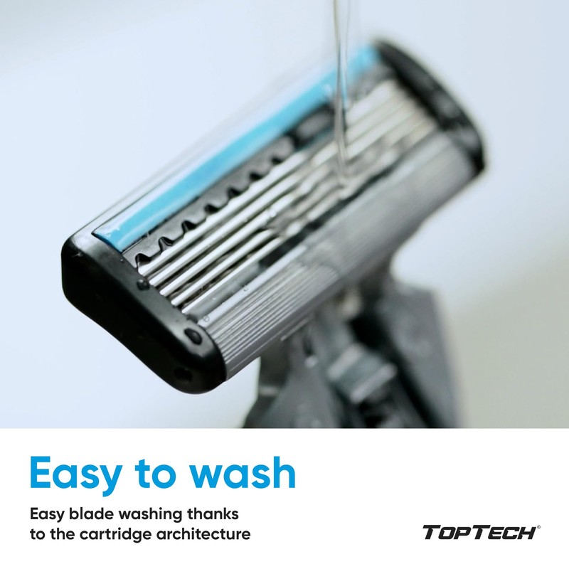 - [Suitable for All Skin Types]: Designed to meet the needs of all skin types, the TopTech PRO 5 razor is suitable for both sensitive and tougher skin, ensuring a comfortable and smooth shave. Advanced Skin Protection: each cartridge includes a lubricating strip enriched with minerals, oils, and aloe vera extract to protect the skin from irritation and ensure smoothness after each use.