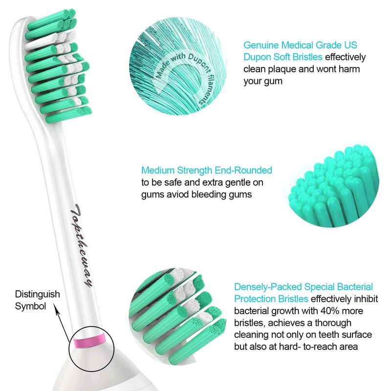 - Medical Grade Bristles- Toptheway toothbrush heads are made with US rounded end medical grade Nylon Bristles. Gentle on your gum and blue indicator bristles fade in color to let you know when it's time to replace the brush head.