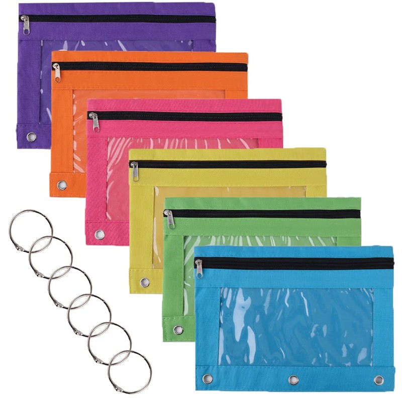 TOPTIE 6 Pack 3 Ring Binder Pencil Pouch, Zipper Stationery Bag with Clear Window for Office Supplie Multicolor