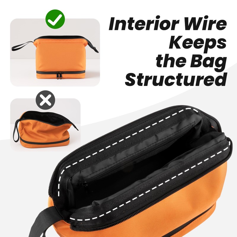 Double layers of compartment elevate this bag's design, featuring a comfortable handle for easy carrying or hanging, plus stiff wire around the opening that allow the bag to stand upright for convenient access.