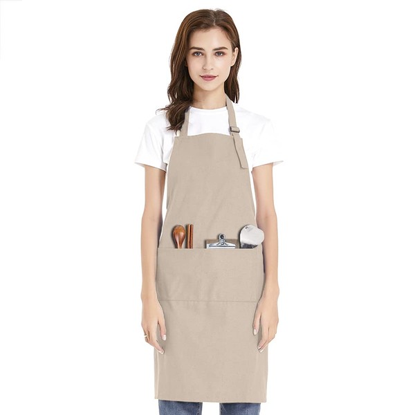 TOPTIE Unisex Cotton Canvas Adjustable Chef Kitchen Aprons with 2 Pockets-Khaki-L
