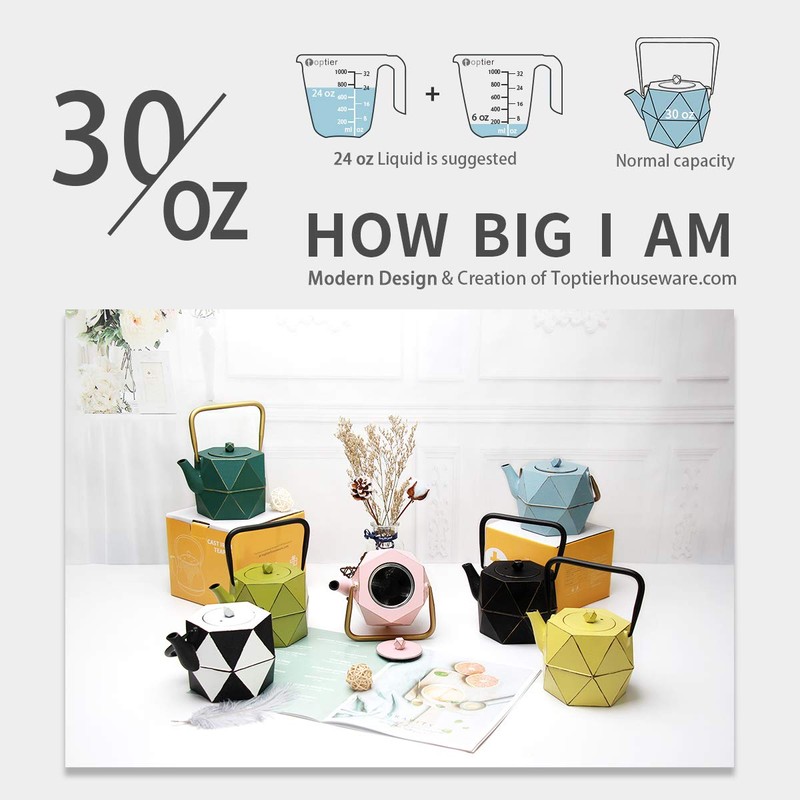 - 💎 A Stovetop Teapot for Gift - The cast iron tea kettle is crafted in a diamond shape, which is an eternal and forever symbol of perseverance. Iron Teapots are available in a variety of capacities and colors for your choice. Capacity - Medium: 30 oz, Large: 40 oz, Extra-Large: 54 oz. Color: blue, black, green, pink, white, yellow. Beautiful toptier packaging has also been designed. An exquisite gift for Dad, Mom, Friends, Family, Wedding, Décor, Stove Top Decorations, Party and Tea Lovers.