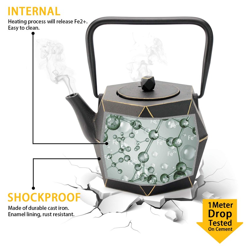 - 💎 Tea Kettle for Stovetop - The cast iron tea kettle is sturdy and protects the teapot from shattering, which is more durable than the general glass/ceramic teapot. The fully enameled interior helps to taste the original and delicious tea. HEAT SOURCE: Induction Cooker, Electric Stovetop, Ceramic Stove Top, Gas Stovetop Safe, As a Humidifier Wood Burning Stove, Halogen Cooker, Fireplace for Humifying Moisture in the Air. Note: Low heat/Moderate heat is suggested, PROHIBITION OF DRY BURNING.