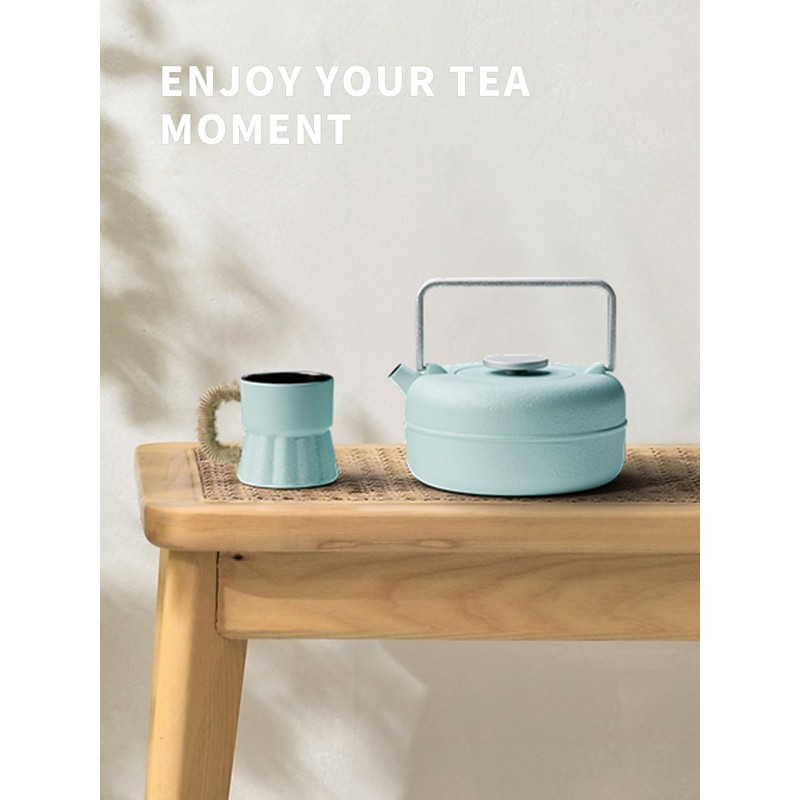 Toptier Teapot with Removable Infuser, Cast Iron Tea Kettle Stovetop Safe, Solid Geometry Cylinder Design Tea Pot Coated with Enameled Interior for 27 Ounce (800 ml), Babyblue