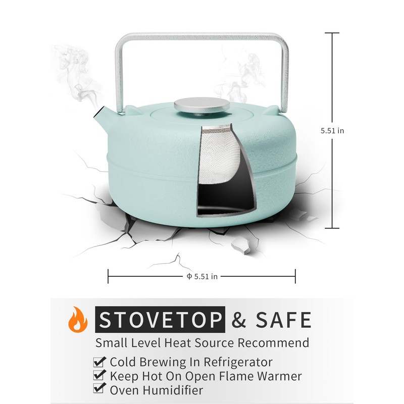 - 🍵 Small Cast Iron Tea Kettle - Teapot FULL-LOAD CAPACITY: 27 oz / 800 ml, RECOMMENDED BOILING CAPACITY: 24 oz / 700 ml. The cast iron teapot allows gradual and even heating. It will help infuse the greatest amount of flavor from the tea leaves into the water. Cast iron teapot could break down the elements of Fe2+, which is beneficial to your body. Japanese cast iron teapot also has long heat preservation.