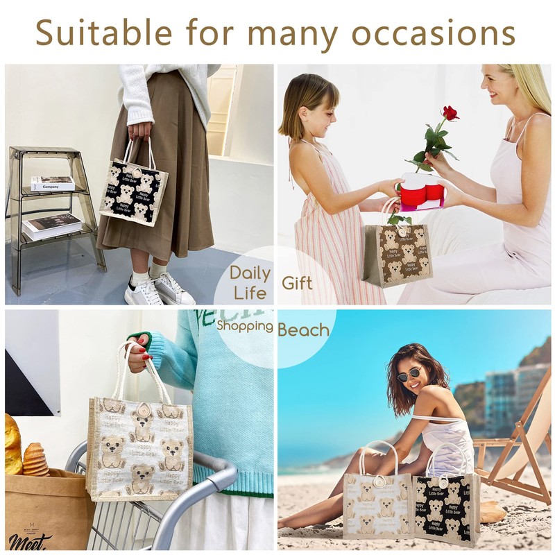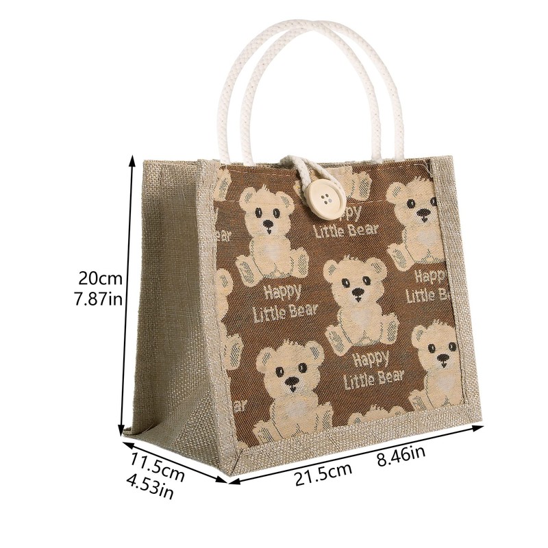 TOPTIME 3 Pack Mini Jute Tote Bag with Bear Prints Burlap Gift Totes with Handles Jute Burlap Tote Bags Jute Hessian Bags Small Gift Bag Lunch Sandwich Bag (Beige, Brown, Black, Button Closure Design)