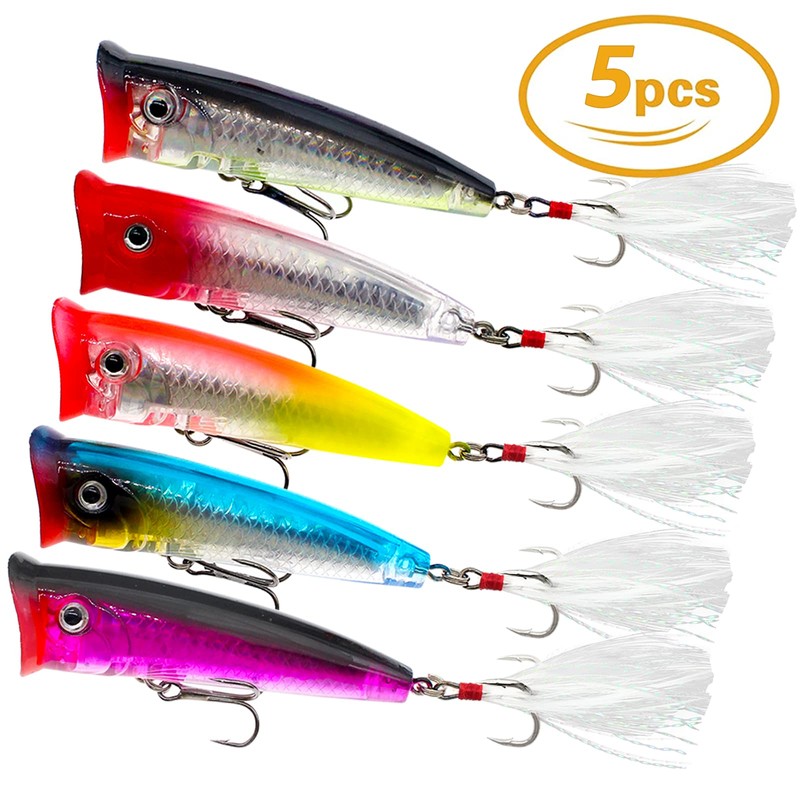 - 【Specialized in Bass】It comes in 5 colors of top water bait, which is suitable for all forms of bass fishing. Our popper bait has super sharp hooks and flashing feathers to tease the tail, and will never let the bass disappear.