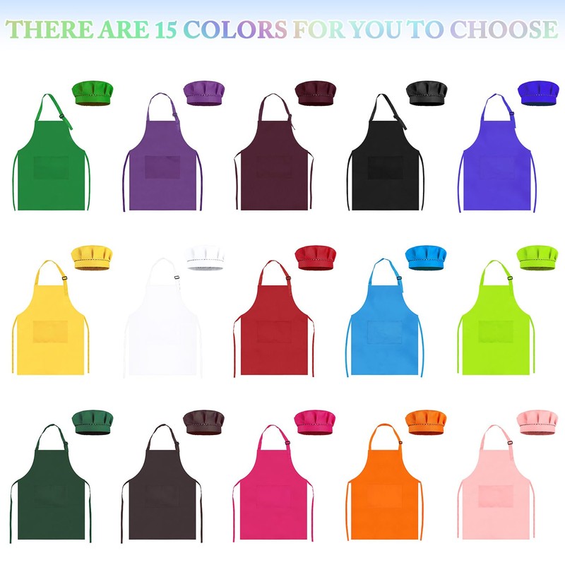 - Practical Design Our kids cooking apron and hat set is designed with an adjustable neck strap, and the chef hat is designed in mushroom shape and with elastic bands, which prevent the children's head from being pinched. Besides, there are large two pockets on the front for easy holding on small kitchen utensils, baking accessories, drawing pens and other tools.