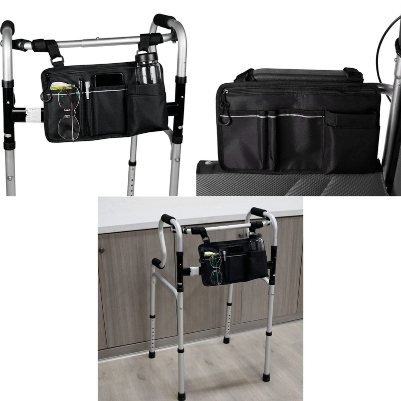 - MULTIFUNCTIONAL This is a multifunctional wheelchair side storage bag with 3 front pockets and a zipper compartment, two mesh pockets on the back, plenty of space to store all your personal items, convenient for daily carrying your mobile phone, wallet, water bottle and other things necessities with you.