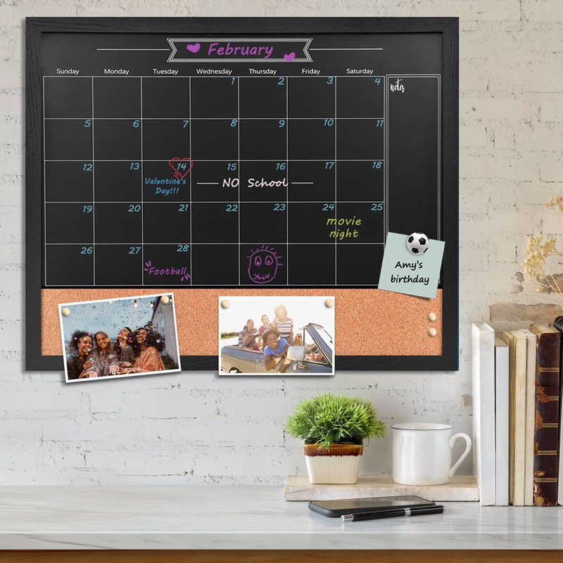TORASO Magnetic Chalkboard Calendar Corkboard, 18" x 22" Combination Chalk Board Bulletin Board, Black Wood Framed Blackboard Calendar Cork Combo Board(ZHHB-BK-4555)