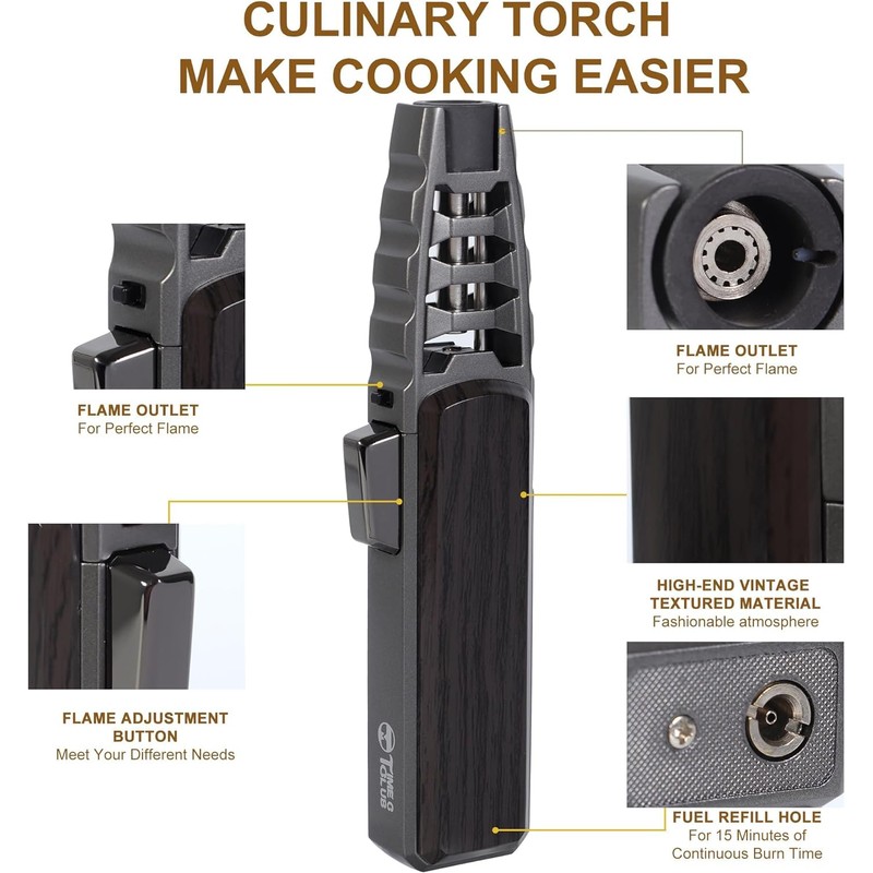 - 🔥【Refillable & Adjustable Jet Flame】The butane torch lighter can refill butane when out of gas, and you can turn the fuel adjustment wheel on the side of the lighter towards the (+) mark to increase the flame, turn the wheel towards the (-) to decrease the flame to achieve a desired height. With a safety lock, the lighter can prevent accidental ignition and misused by children.(Butane Gas Not Included due to shipping regulations.)