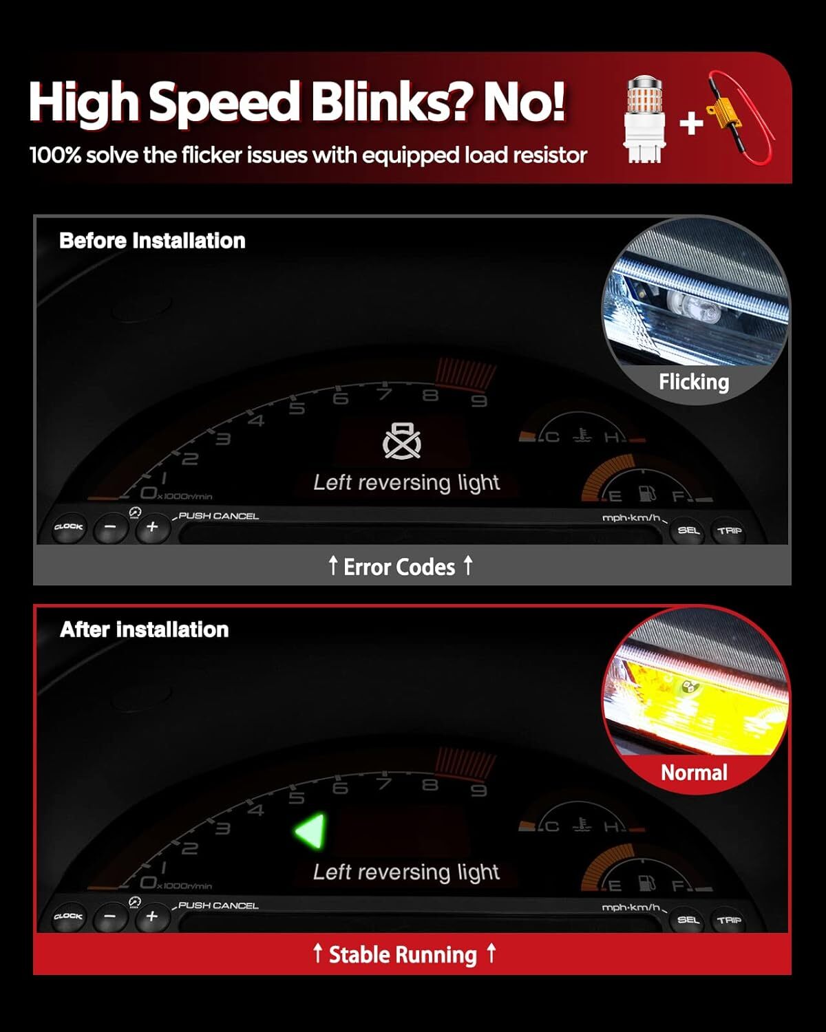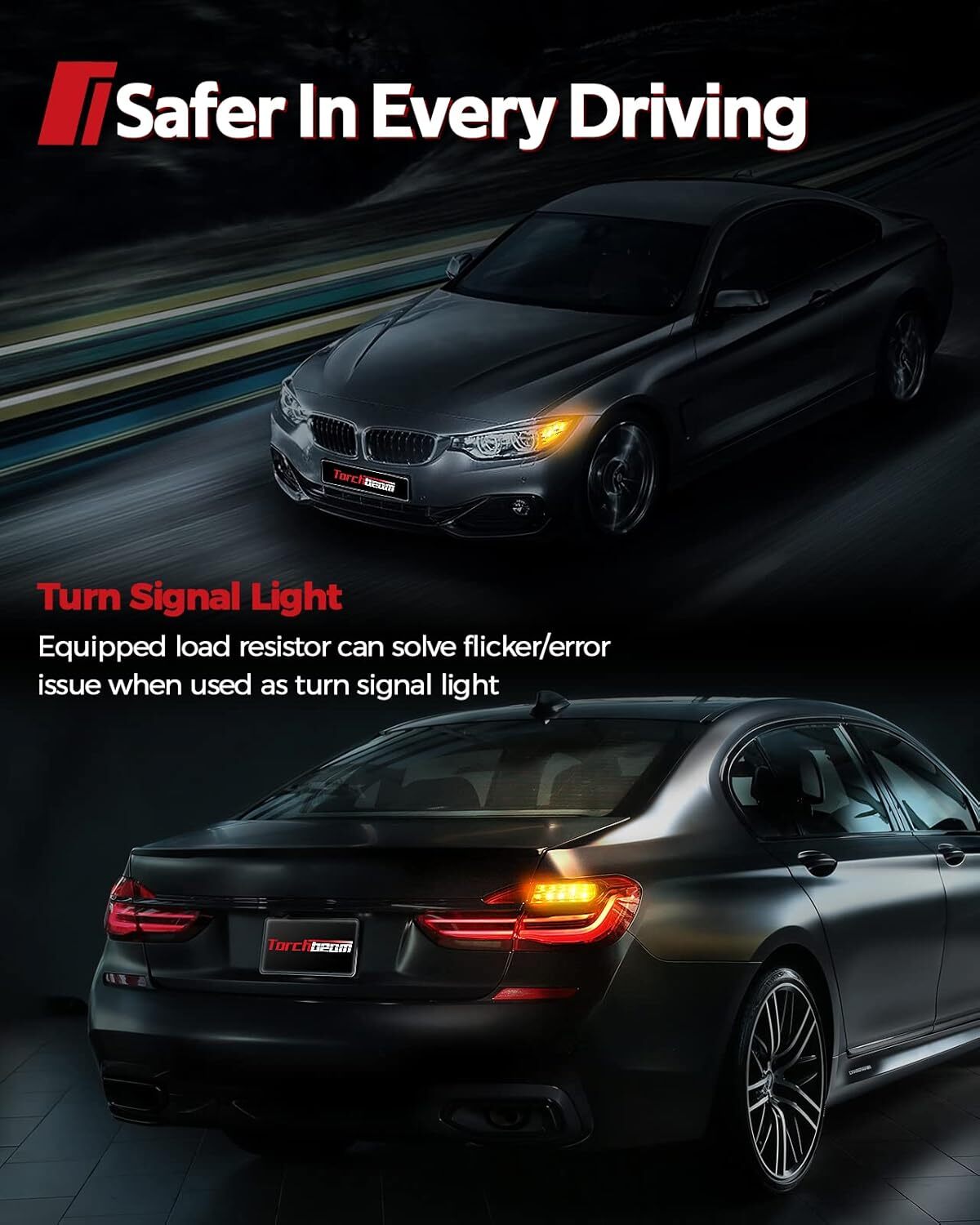 2 Pack 3157 Amber: Turn Signal Lights, Parking Lights, Third Brake Lights, Stop Lights, Side Marker Lights, Brake Lights 2 Pack 3157 White: Reverse Lights, Backup Lights, Brake Lights, Turn Signal Lights, Daytime Running Light, License Plate Light, Parking Lights, Side Marker Light,Tail Light, Stop Lights, etc Note: We prepared 2 load resistors for turn signal lights to preventing hyper flashing or error warning when used for some sensitive models