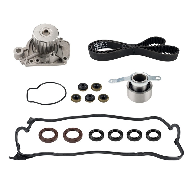 - 【Kit Includes】1 Timing Belt (104 round teeth),1 GMB Timing Belt Roller Tensioner Bearing,1 Camshaft Seal,Tenionser Spring - is not included,1 Front Crankshaft Seal,1 Water Pump w/ Gasket,1 Valve Cover Gasket,4 Spark Plug Tube Seals,5 Grommets