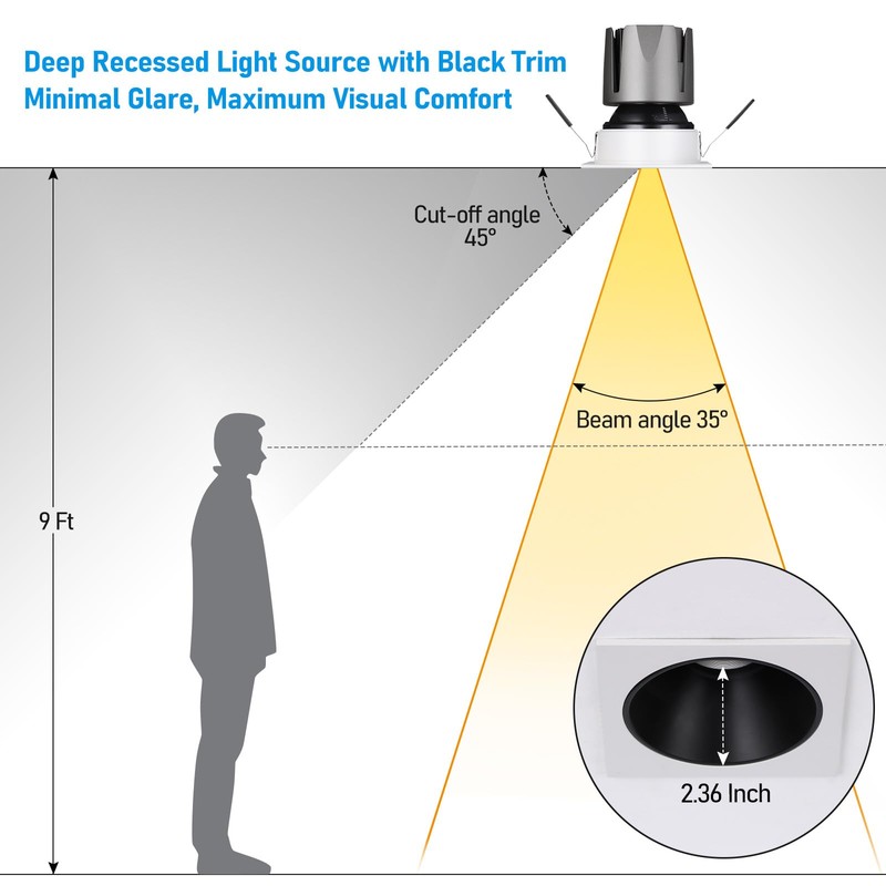 • Deep Recessed Anti-Glare: The light source of this square recessed light is deeply recessed with a matte black inner trim, minimizing ceiling reflections. Ensures glare-free illumination, delivering layered light distribution for a premium atmosphere