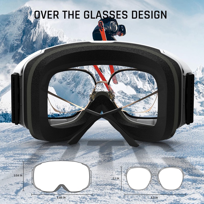 - UNIVERSAL HELMET COMPATIBILITY & OTG - Widening printed or jacquard extra long elastic strap ensures great helmet compatibility with all helmets. And the silicone straps on the strap help the ski goggles from sliding from the helmet. OTG (OVER-THE-GLASSES) DESIGN - Ski goggles that fits over glasses.UPGRADE QUICK CHANGEABLE MAGNETIC LENS SYSTEM - 10 Magnets spots hole the lens tight and you can enjoy changing the lens in seconds.