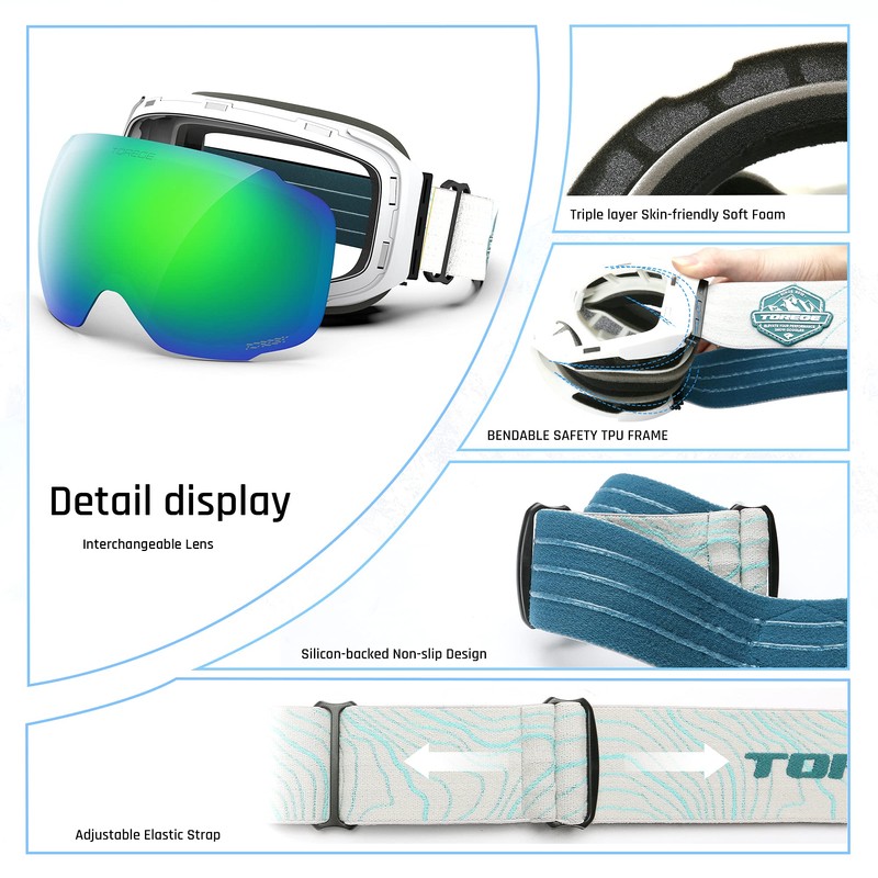- DOUBLE LENS & EXCELLENT OPTICAL CLARITY - Dual-layer lens technology with anti-fog coated inner lens gives you a FOG-FREE SKI EXPERIENCE. While the outer features for amazing scratch and impact resistance, combined with TORIEX lens technology, make sure maximum protection for safety, provide unrivaled field of clear view.
