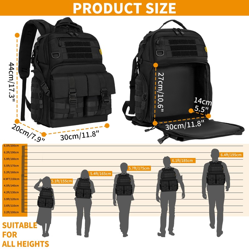 - 【Large Capacity】:Measuring 17.3"x11.8"x7.9", this tactical camera backpack features three organized zones. The upper compartment stores clothes, shoes, towels, or daily essentials, while the lower camera section accommodates DSLRs, lenses, flashes, and drones. Customizable dividers let you reconfigure space as needed. A dedicated 15.6" laptop sleeve protects your tech gear during transit