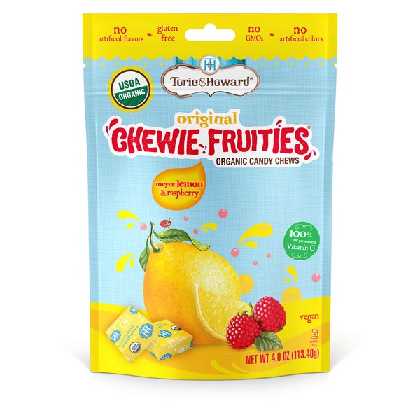Torie and Howard's new chewy fruities organic candy chews. Usda organic and kosher certified. Chewy fruities contain a daily requirement of vitamin c. No artificial colors or flavors, vegan, gluten free, soy free, casein free, nut free. Fresh tasting fruit flavors-Meyer lemon and raspberry. Each bag contains 4 ounce of candy. Made in the usa.