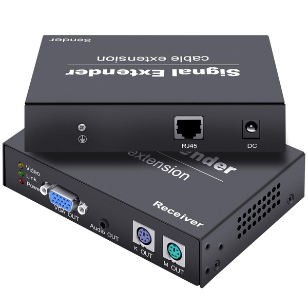 • VGA PS2 KVM Extender: VGA kvm extender can extend vga, ps2 keyboard, mouse and audio signals up to 394 feet (120 meters) through a single cat5e/6/7 network cable, and can receive real-time image signals at the remote end with almost zero latency