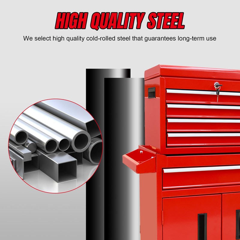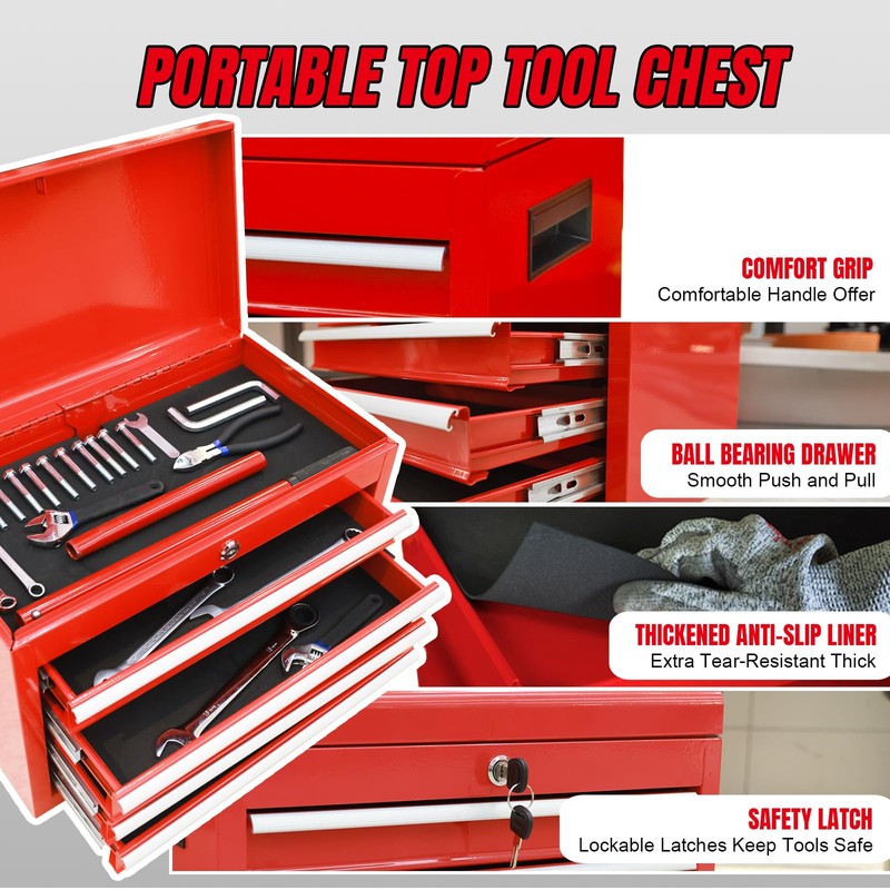 - LONG-TERM USE: The tool chest cabinet is constructed of high quality cold-rolling steel and painted with anti-rust corrosion-resistant coating; Thickened anti-slip top your tools from scratch. Reinforced package protects chest from damage.