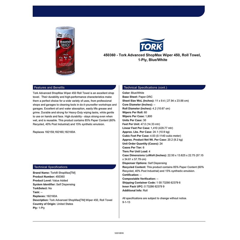 Tork Advanced 450360 ShopMax Wiper 450, Roll Towel, 1-Ply, 11" Width x 9.4" Length, Blue/White (Case of 30 Rolls, 60 per Roll, 1800 Towels)