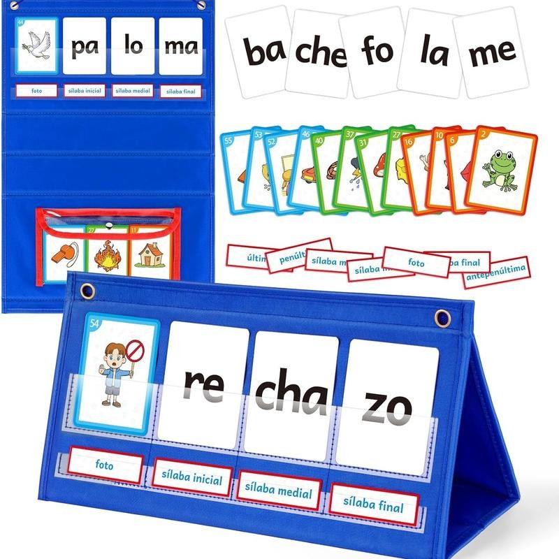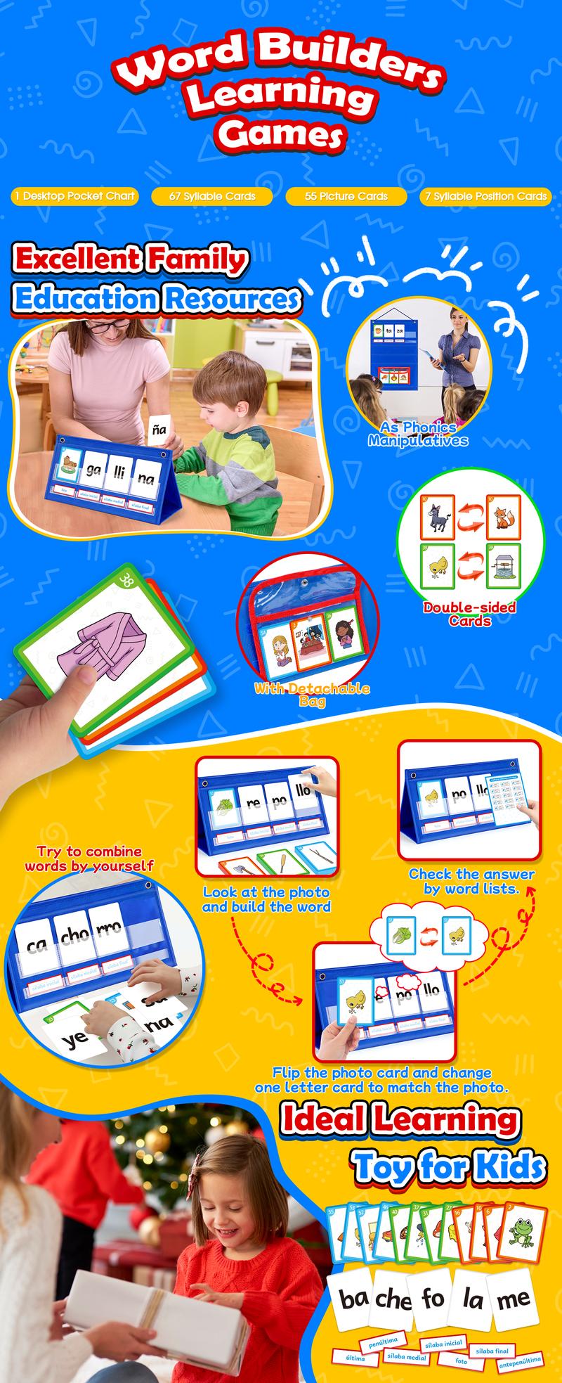 - 【Spanish Word-Building Game】Look at the picture to build a word, then flip the picture and change the beginning or ending syllable to form a new word. Includes 55 picture cards and 67 syllable flash cards for hands-on learning