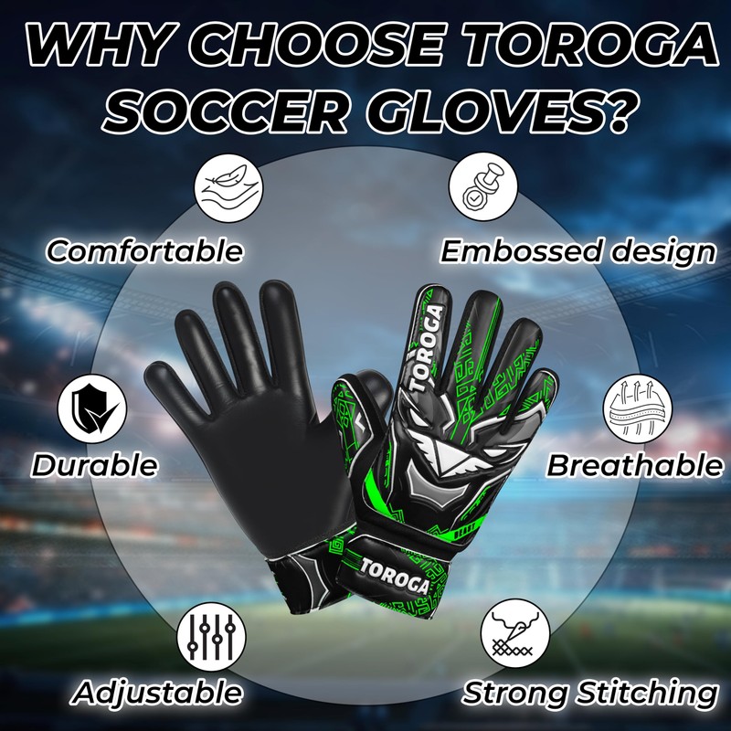 # Strong Grip: TOROGA boys football goalie gloves are made up of high quality composite materials of EVA and latex Foam. Palm area of football goalkeeper gloves kids with latex provides high viscosity and reduces slipping level that may help to improve your grip in matches. ✔