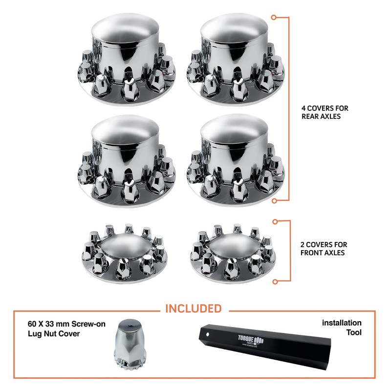 TORQUE Chrome Front and Rear Axle Complete Wheel Cover Set 33mm Screw-on Lug Nut Covers for Semi Trucks (Installation Tool Included) Standart Hub Caps Kit (2 Front & 4 Rear) (TR082)