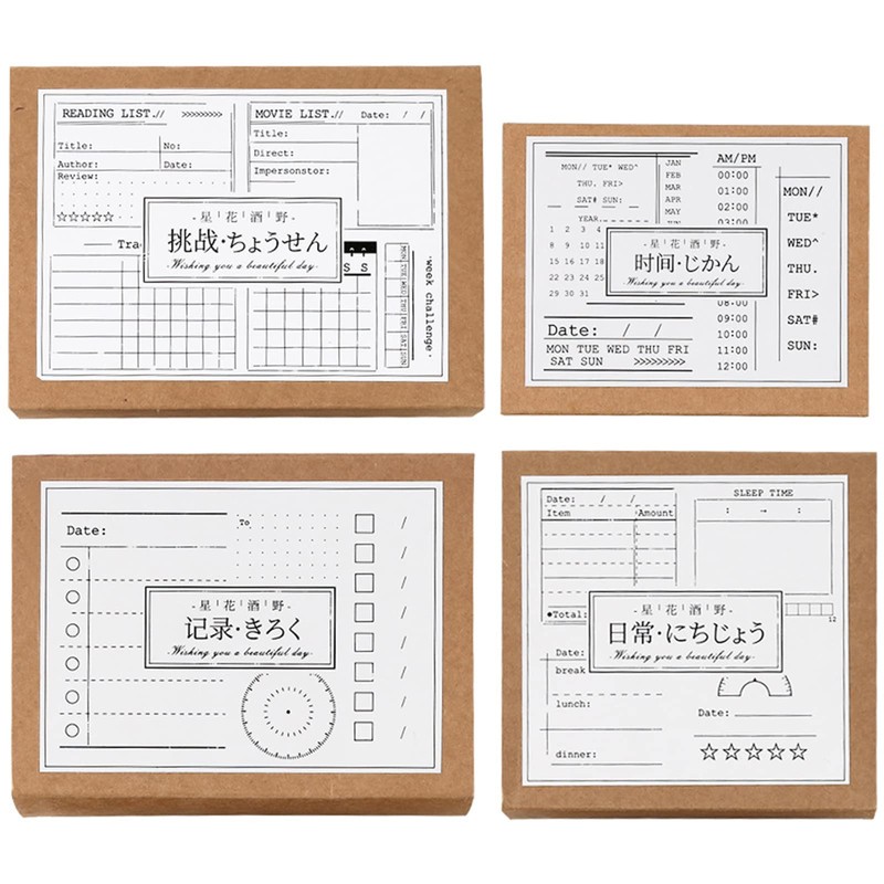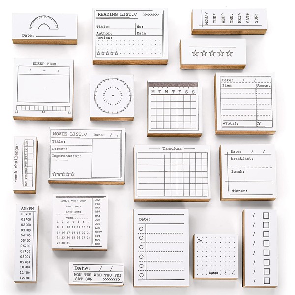 - Package includes 18 pieces wooden journal stamps, 4pcs record type(memorandum, to do list, dot message note, pie chart), 4pcs time type(calendar, timeline, weekly plan, date), 5pcs daily type(financial management, sleep time, meal time, ranting chart, weight chart) and 5pcs challenge type(reading list, movie list, tracker, monthly calendar, week challenge). Assorted 4 styles to meet your various need in daily life. Size chart refer to the pictures