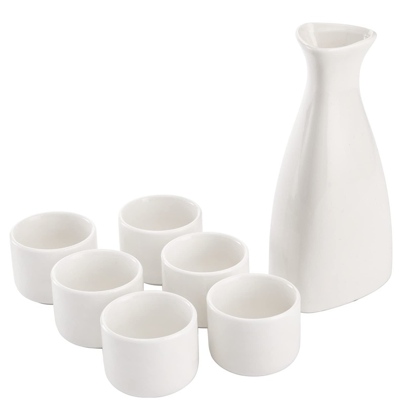 Tosnail 7 Pieces Ceramic Japanese Sake Set, 1 Serving Carafe and 6 Cups - White
