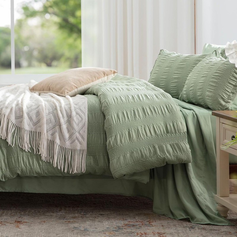 Tospass Seersucker Bed Linen 155 x 220 cm Sage Green Embossed Striped Bedding...