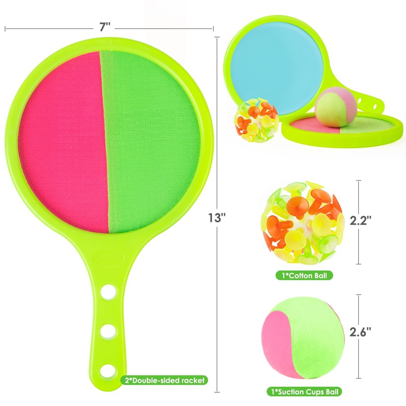 - Toss and Catch Ball Set: Elevate your outdoor fun with our comprehensive Toss and Catch Ball Set, inclusive of 4 catch rackets and 4 balls—featuring both cotton and suction cup variants. This all-inclusive package ensures endless entertainment and excitement for players of all ages and skill levels.