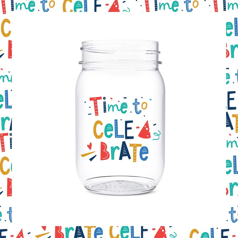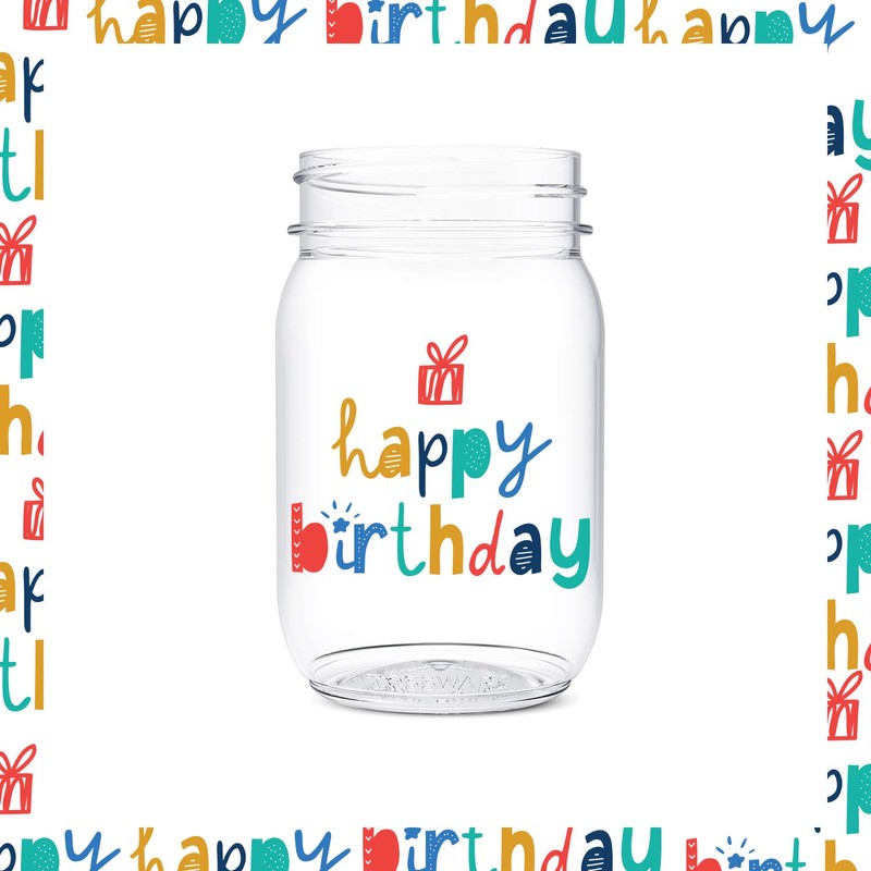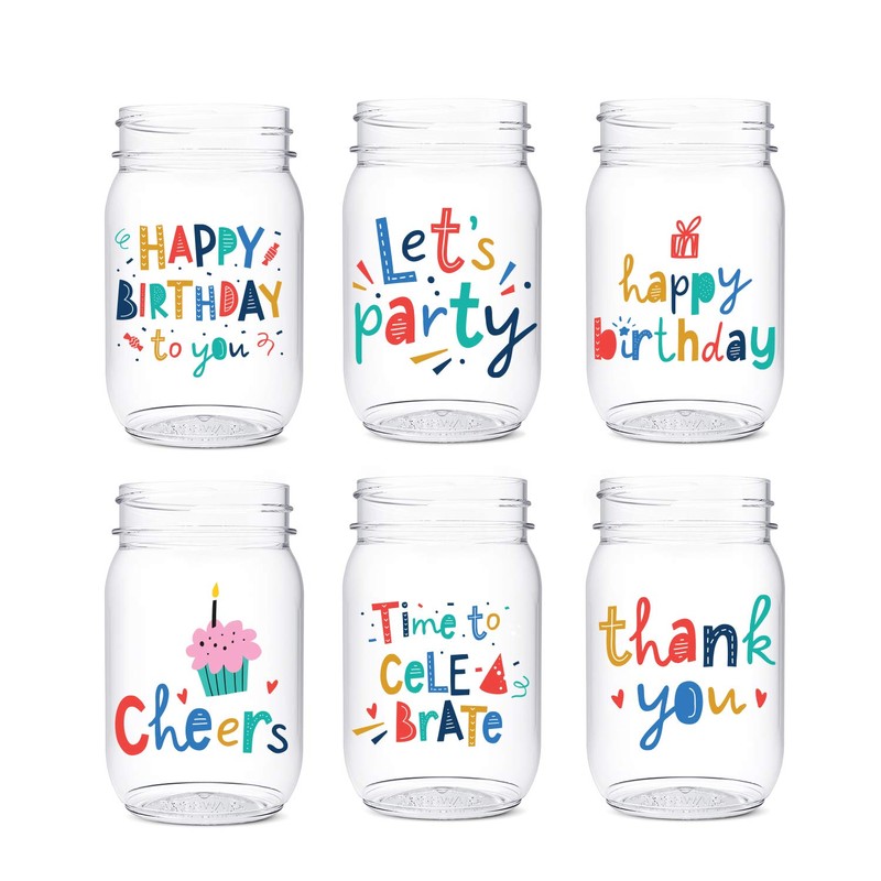 TOSSWARE POP 16oz Mason Beaming Birthday, SET OF 6, Premium Quality, Recyclable, Unbreakable & Crystal Clear Plastic Printed Mason Jars