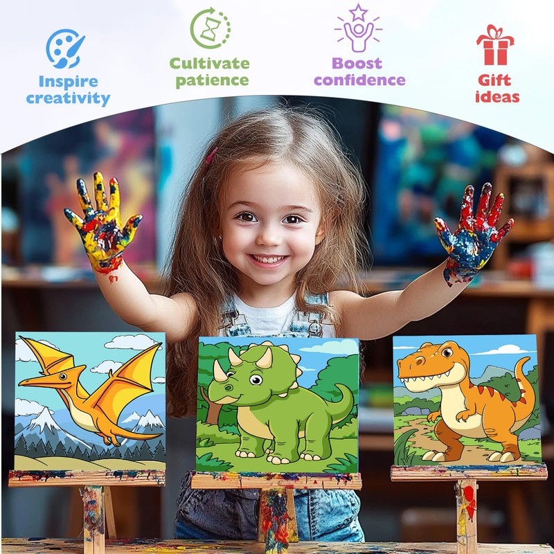 TOSTOG 4 Pack Paint by Number for Kids with Wooden Frame, DIY Dinosaurs Paint by Numbers for Kids Ages 4-8-12, Acrylic Oil Painting Kits Easy Paint by Number for Gift Home Wall Decor 8in X 8in