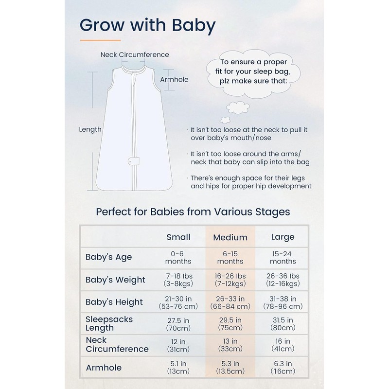 Our baby sleep sack is thoughtfully designed to provide a roomy and secure fit, promoting healthy hip development during sleep. Its clever design prevents the blanket from being kicked off, ensuring your baby remains safe and secure throughout the night. Available in sizes ranging from 0-6 months, 6-12 months, 12-18 months, and 12-24 months,24-36 months