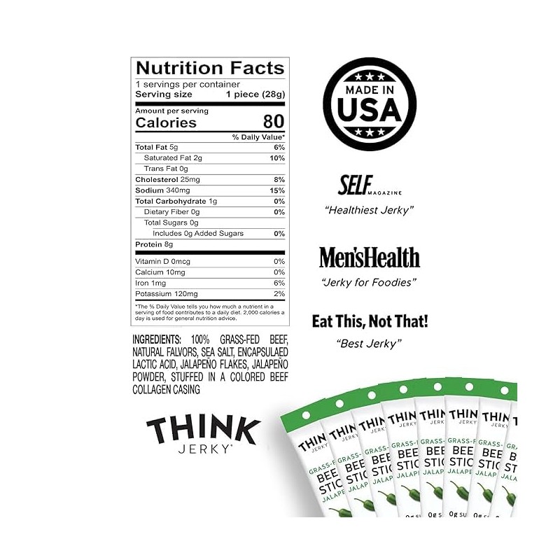 (Total 20 Sticks) Think Jerky, Jalapeno Grass-Fed Beef Sticks (1.0 oz/Stick)