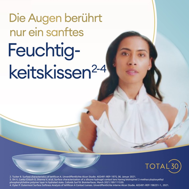 - The unique surface of TOTAL30 contact lenses resists deposits and ensures that the lens is still as clean as on the first day even after a month - with daily cleaning and care [2-5**]
