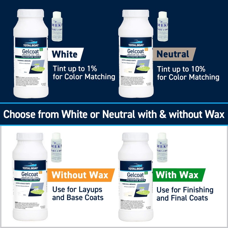 • IDEAL FOR COSMETIC REPAIRS, EASY TO TINT with a polyester resin or gelcoat coloring agent to color match your existing gelcoat; tint white gelcoat to get pastel colors; tint neutral gelcoat for dark, bold colors. Add colorants before adding MEKP catalyst