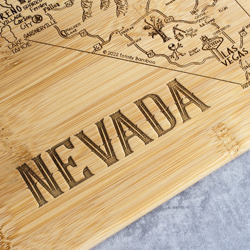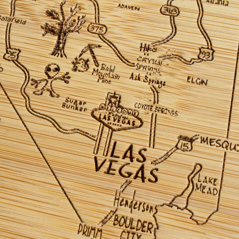 - Savor a slice of The Silver State with this beautifully crafted bamboo cutting board that features engraved artwork highlighting the top towns and attractions in Nevada