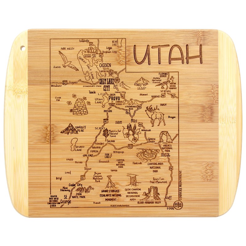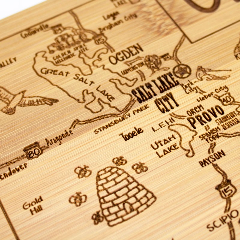 - Savor a slice of The Beehive State with this beautifully crafted bamboo cutting board that features engraved artwork highlighting the top towns and attractions in Utah