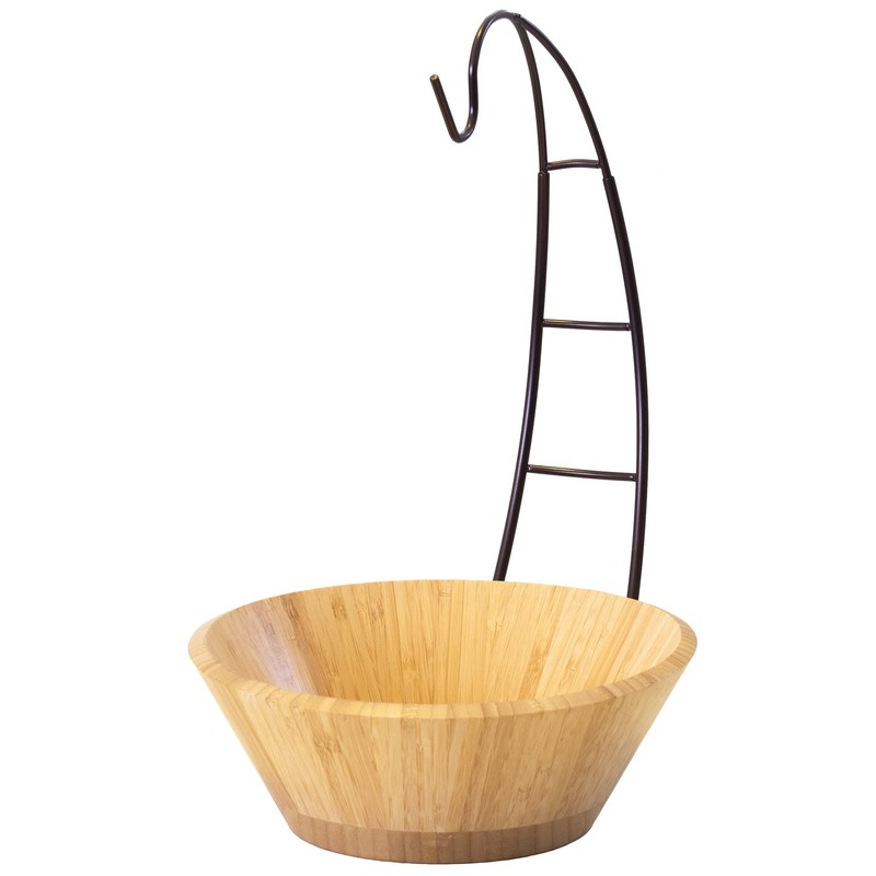 Stylishly store fresh produce with the Totally Bamboo Fruit Bowl with Banana Hanger Hook. This beautifully crafted bowl and banana tree combination is a sleek yet tantalizing way to show off your fresh bought fruit. The banana hanger allows even airflow around the bananas to help them stay fresh longer; while hanging also helps to prevent bruising and brown spots from forming on your bananas. It's a great solution for a variety of hanging fruits such as grapes and cherries too! The included bamboo bowl features a stylish design and ample space to store apples, oranges, mangoes, pears, lemons, limes and much more! The banana hanger also detaches to allow the fruit bowl to double as a centerpiece for company. The fruit bowl is constructed from Moso bamboo— a wonderfully sustainable material that quickly regrows once harvested. Care is easy: simply wipe the fruit bowl and banana hanger with a damp cloth to clean. The Fruit Bowl with Banana Hanger ships knocked down to cut down on its carbon footprint. The hanger assembles and installs into the bowl easily without the need for tools. When assembled, the product measures 10-1/2 inches by 10-1/2 inches and is 16-3/4 inches tall.